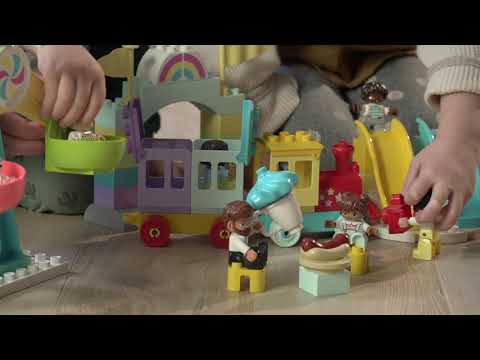 - Содержит семь персонажей DUPLO — двух женщин, мужчину и четырех детей. В наборе есть две горки, механическая карусель, вращающееся колесо обозрения с тремя разноцветными кабинками, поезд и множество веселых дополнений.